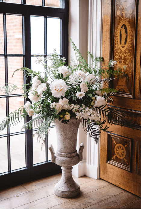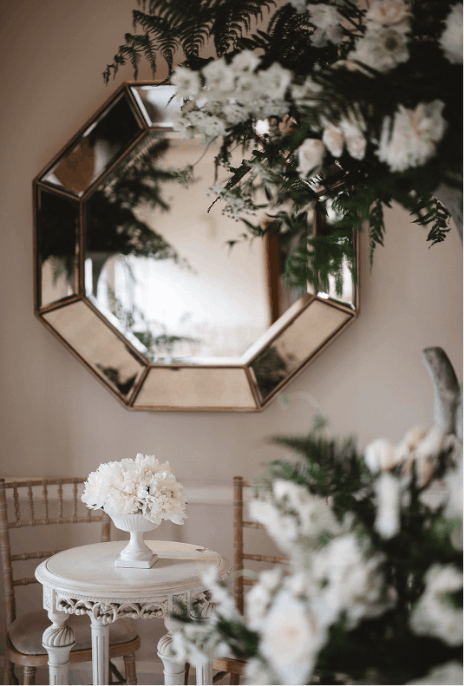 Neutral walls and wooden floorboards let the original architecture and antique chandelier take prominence, while allowing you to reimagine the room through flowers and finishing touches.